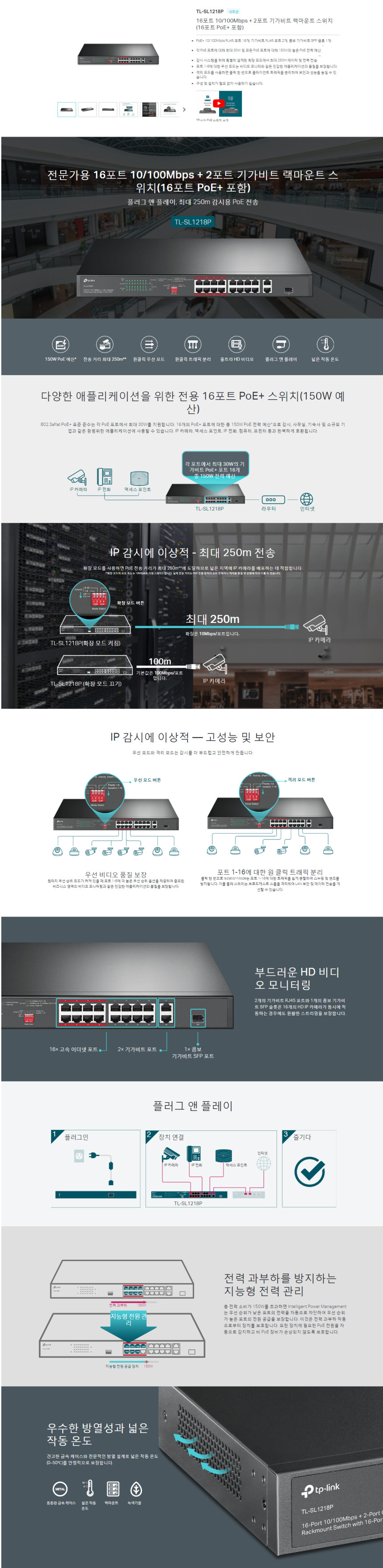 > [티피링크] TL-SL1218P 16포트 PoE 150W DIP스위치[250M확장/우선순위/1-16포트 트래픽분리] 업링크 3포트