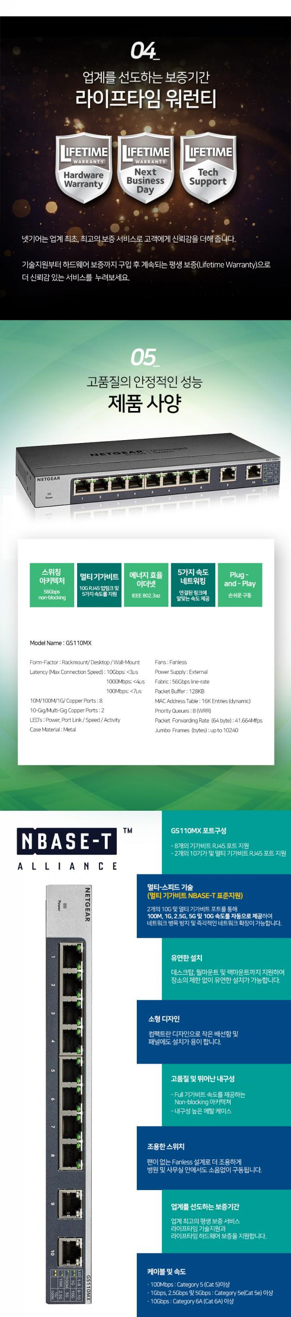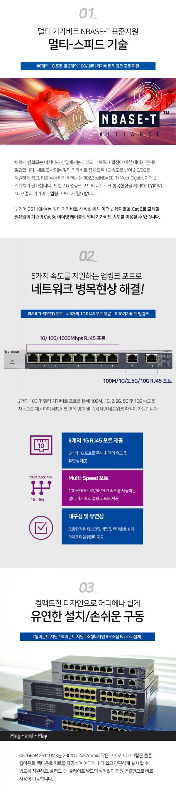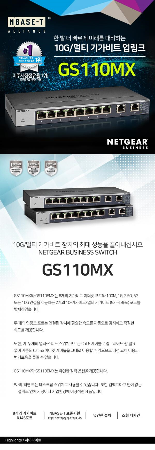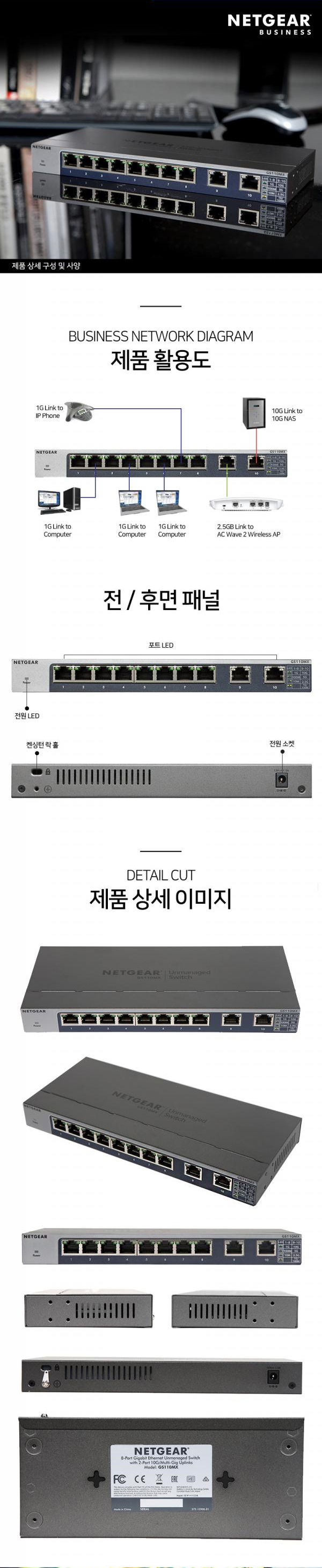 > [넷기어] GS110MX 기가8포트 +10G 2포트 RJ-45 업링크 무설정 스위칭허브